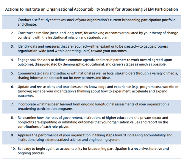 Developing an appropriate accountability system for broadening participation is crucial to achieving a STEM workforce that reflects the diversity of the American population. Colleges and universities, on the front line of STEM research and education, must lead the way, while NSF can function as the lead catalyst among federal agencies for incentivizing principal investigators (PI) and higher education institutions to move with urgency toward achieving this goal.