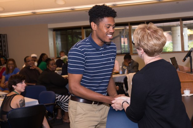 Jarris Williams is greeted to the 2014 TAP program by President Beth Stroble. This year, Williams will serve as a TAP Residential Advisor for the 2017 summer program. He currently is a junior in the Leigh Gerdine College of Fine Arts at Webster and works in the Academic Resource Center.