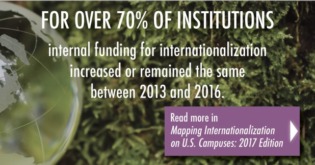 Over 70 percent of institutions said that internal funding for internationalization increased or remained the same between 2013 and 2016, according to Mapping Internationalization on U.S. Campuses: 2017 Edition.