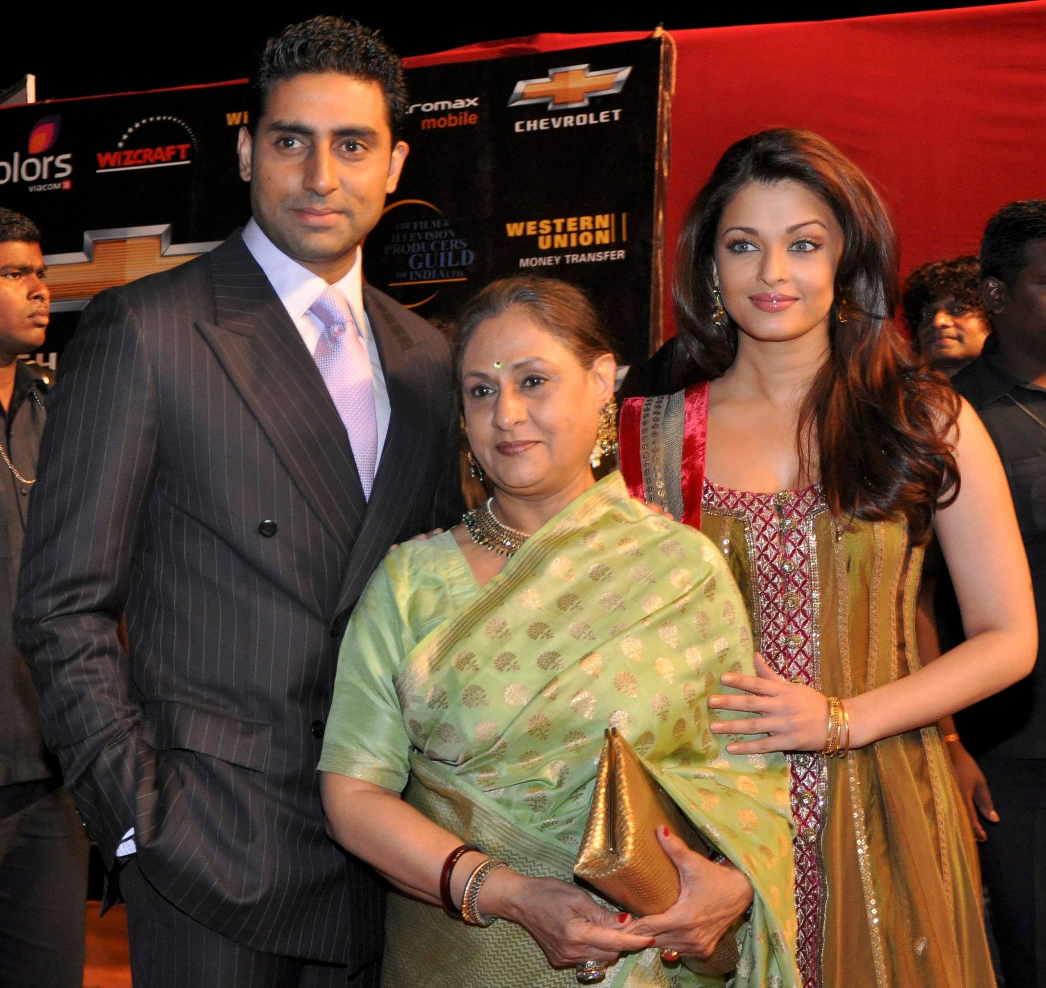 Aishwarya Rai Bachchan& family: Aishwarya Rai Bachchan at the Apsara award posing with mother-in-law and actress Jaya Bachchan and husband Abhishek Bachchan.