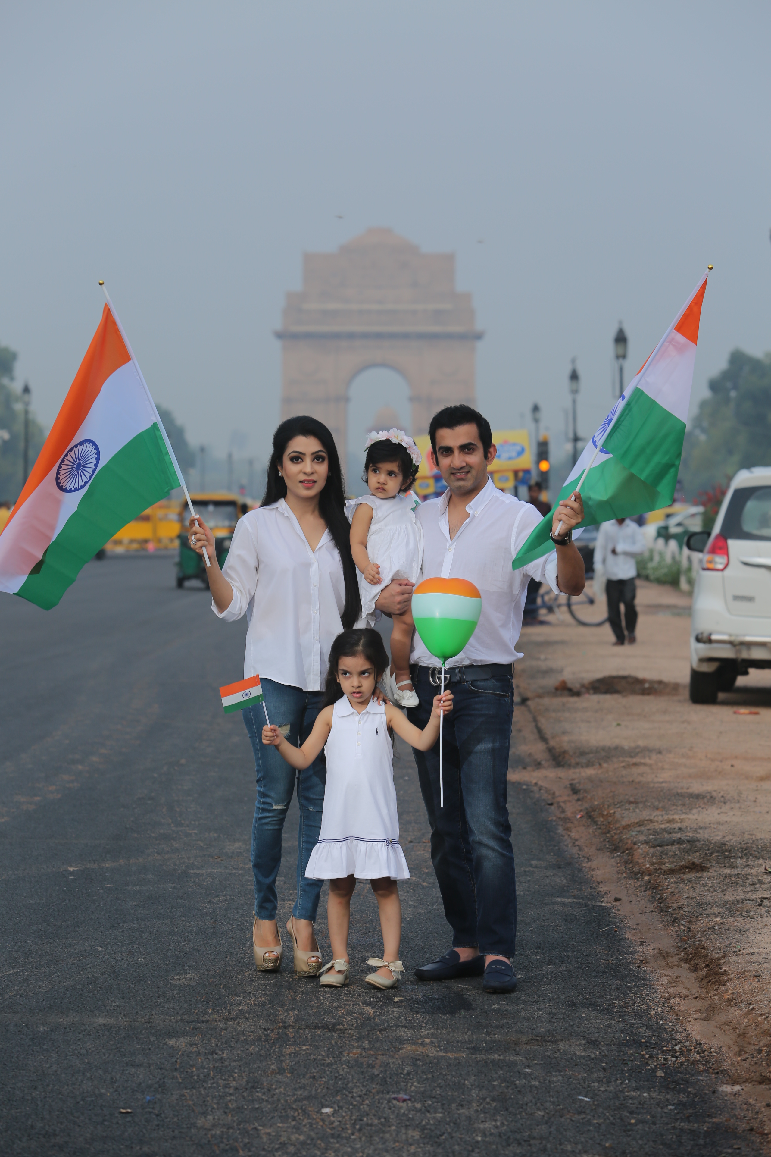 Former cricketer Gautam Gambhir is posing with daughters Aazeen and Anaiza and wife Natasha on occasion of Independence Day in New Delhi.