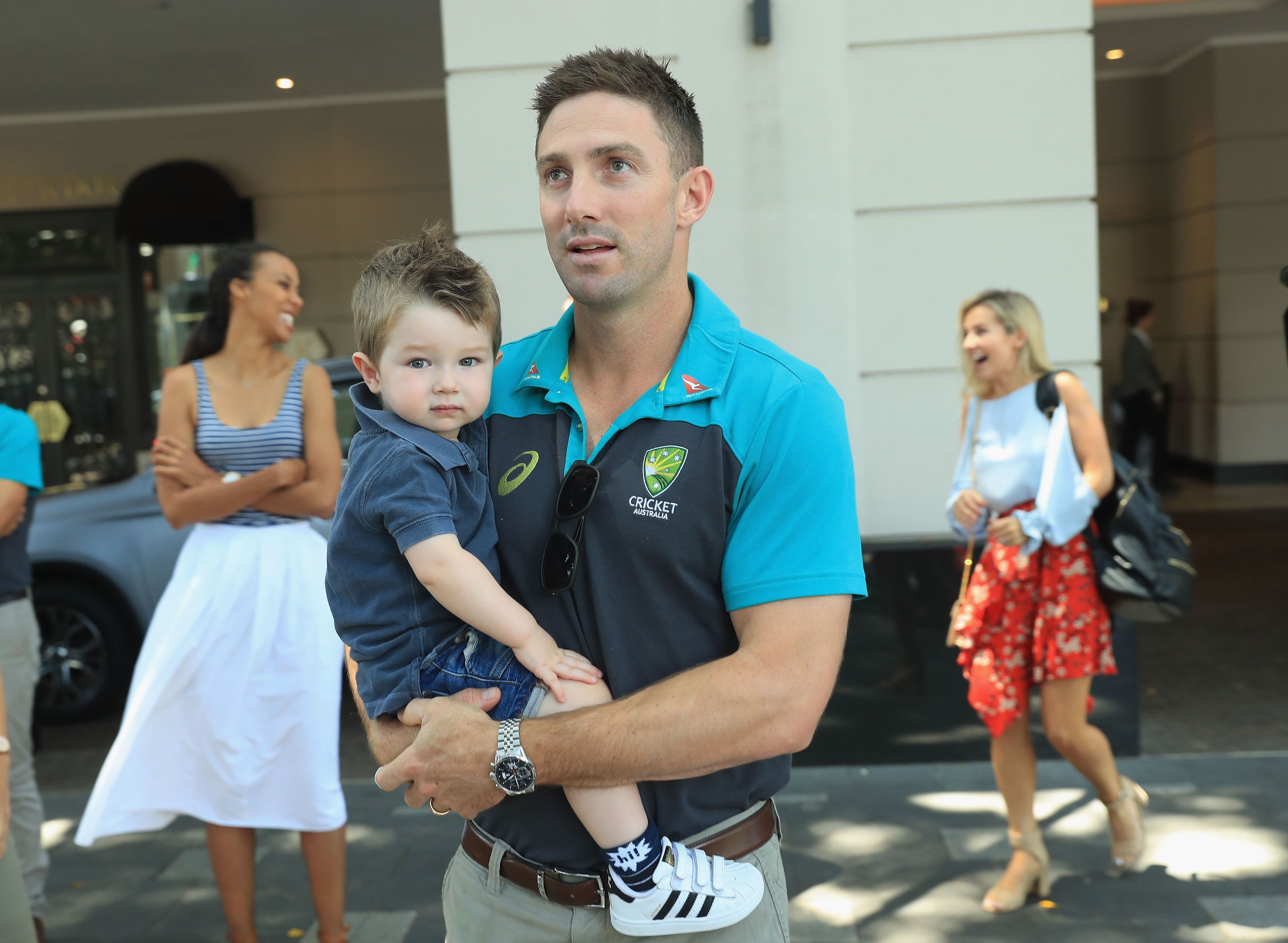 Australian cricketer spotted holding his son Austin in Sydney, Australia on 1 January 2018.