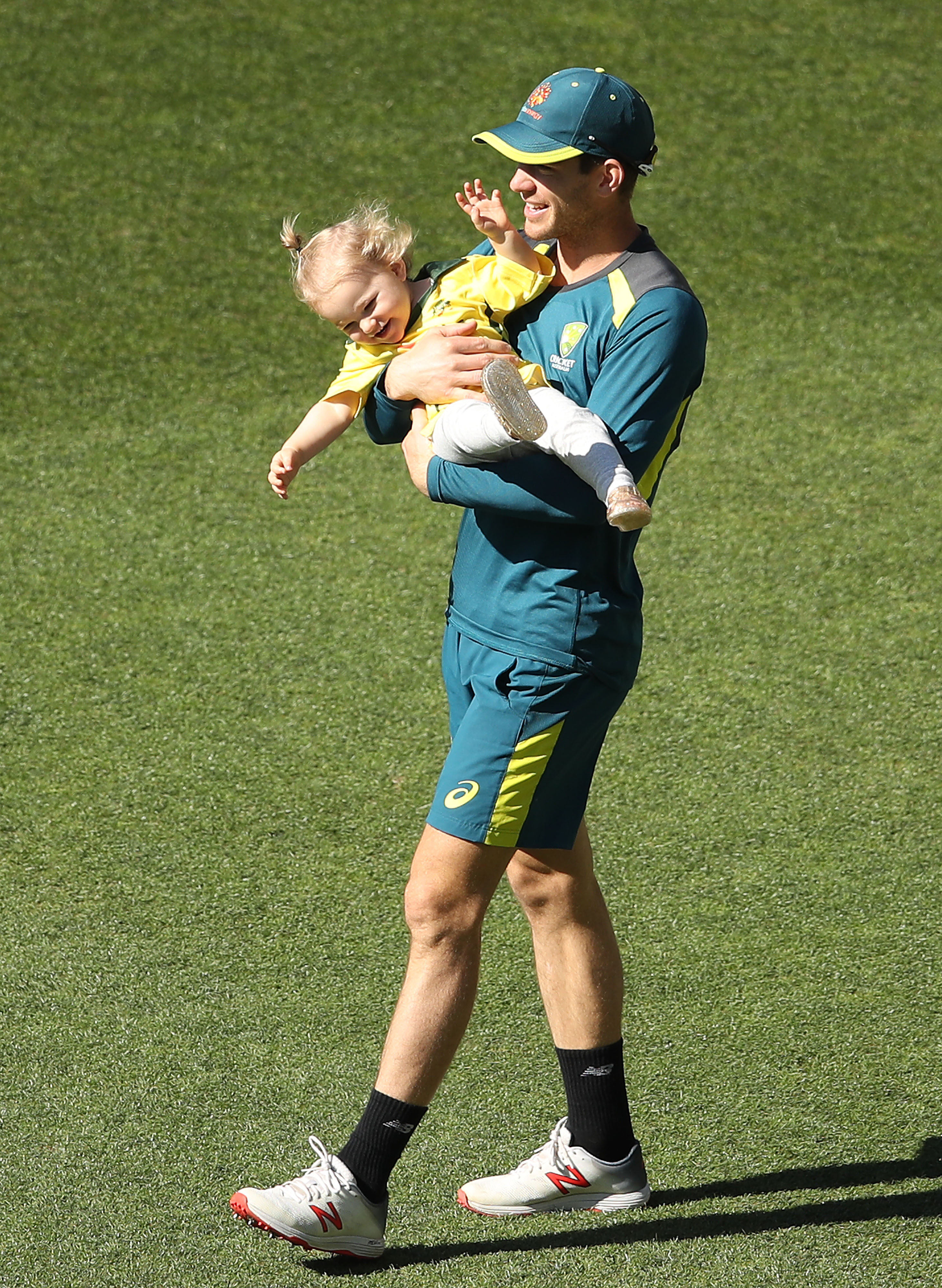 The cricketer of Australia Tim Paine is seeing holding his daughter Milla at Melbourne cricket ground.
