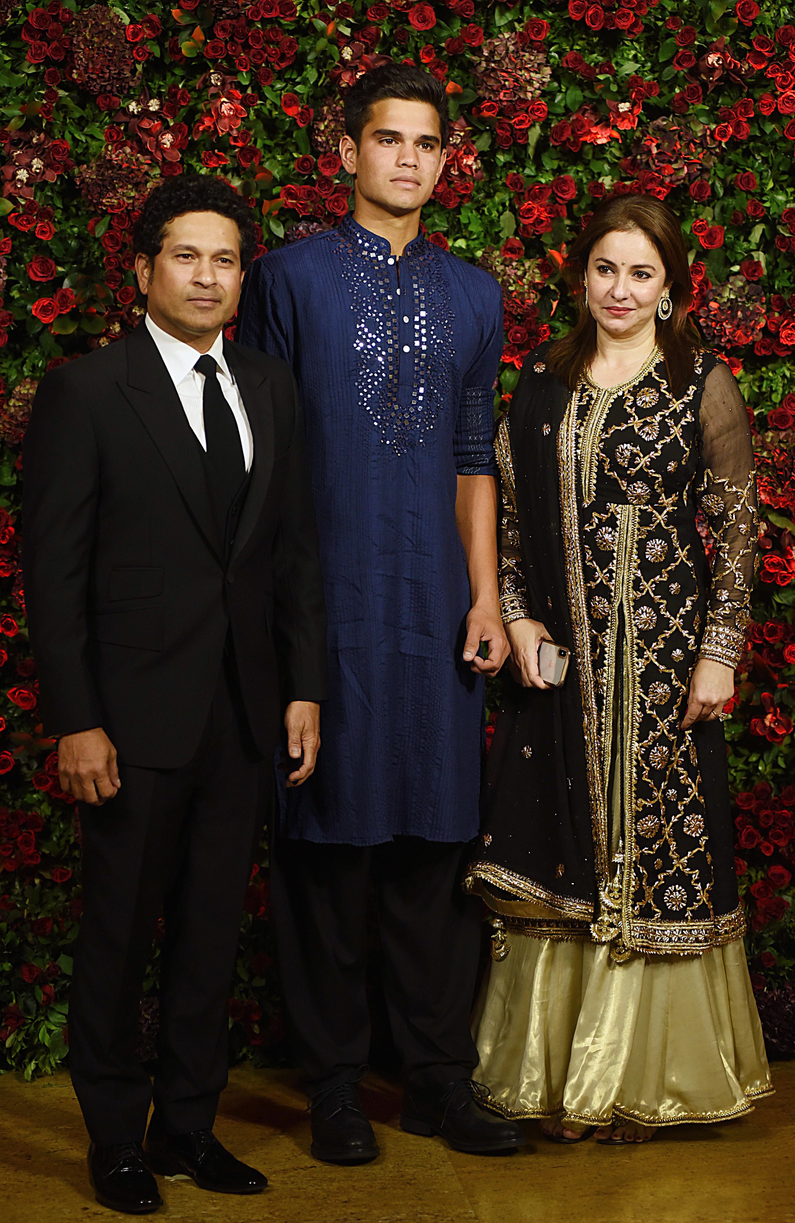Former ace cricketer Sachin Tendulkar is posing with his son Arjun and wife Anjali at an event in Mumbai.