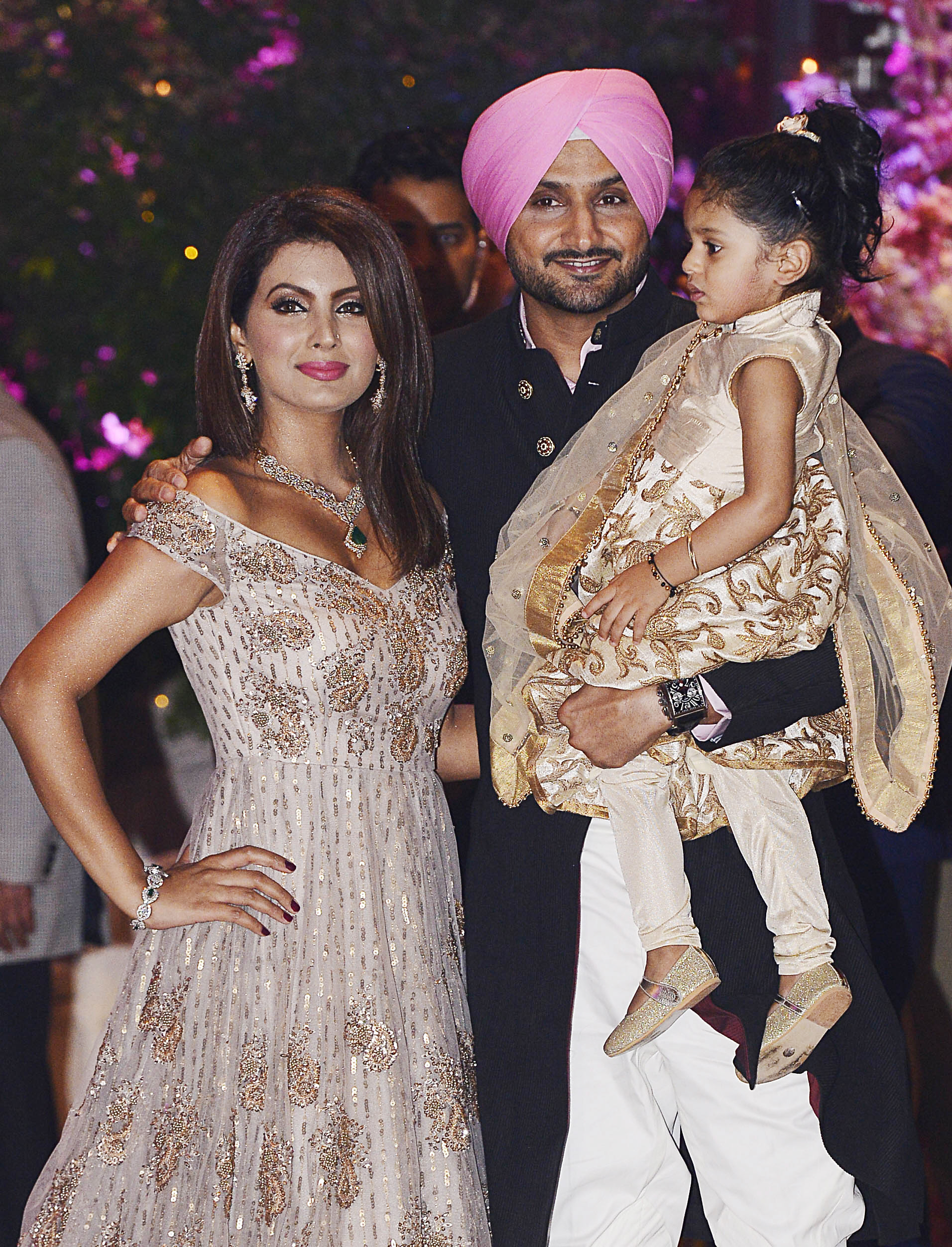 Former Indian bowler Harbhajan Singh with wife former actress Geeta Basra and daughter Hinaya at an event in Mumbai.