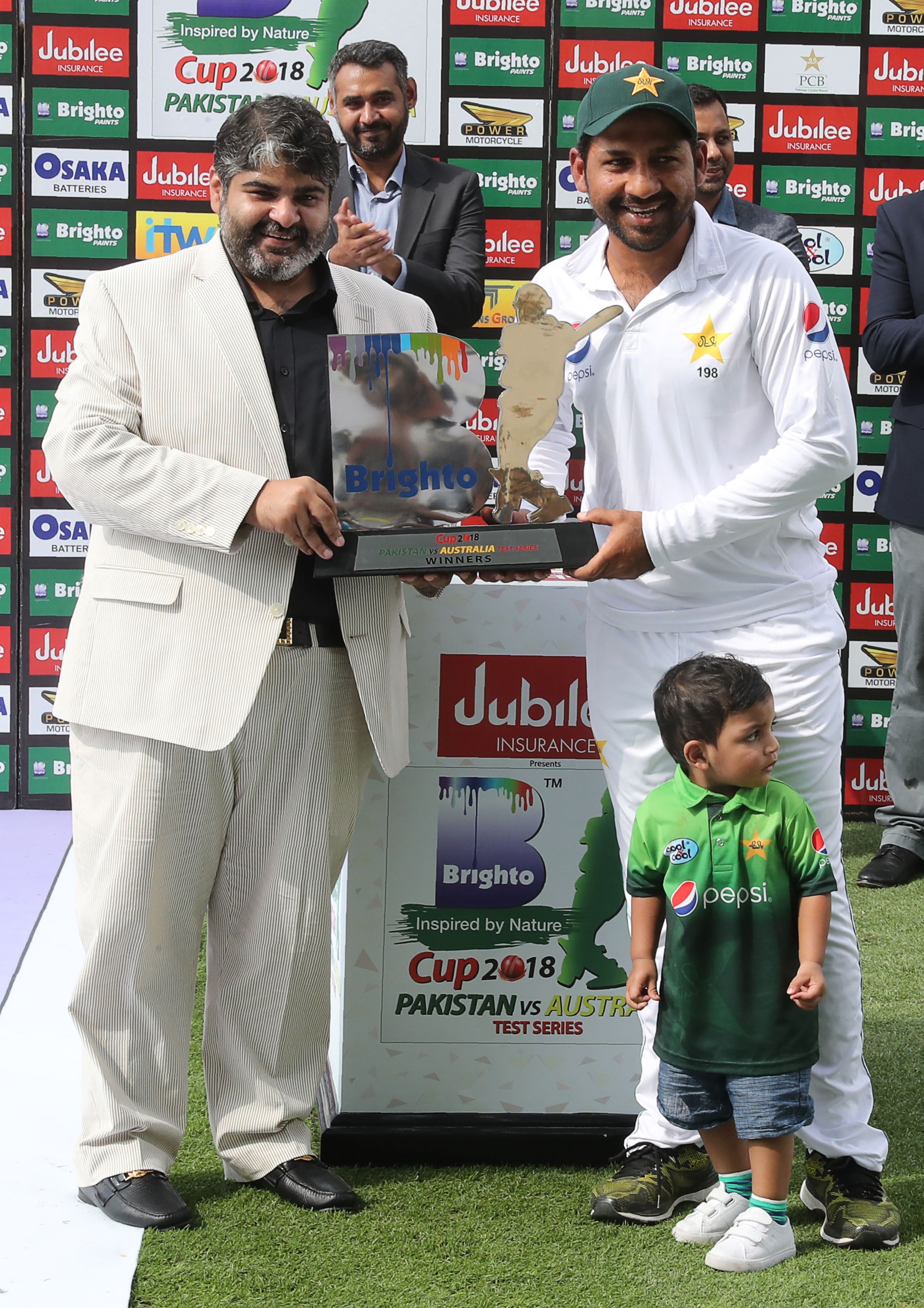 Pakistani cricketer Sarfaraz Ahmed is taking trophy with company of his son Abdullah.