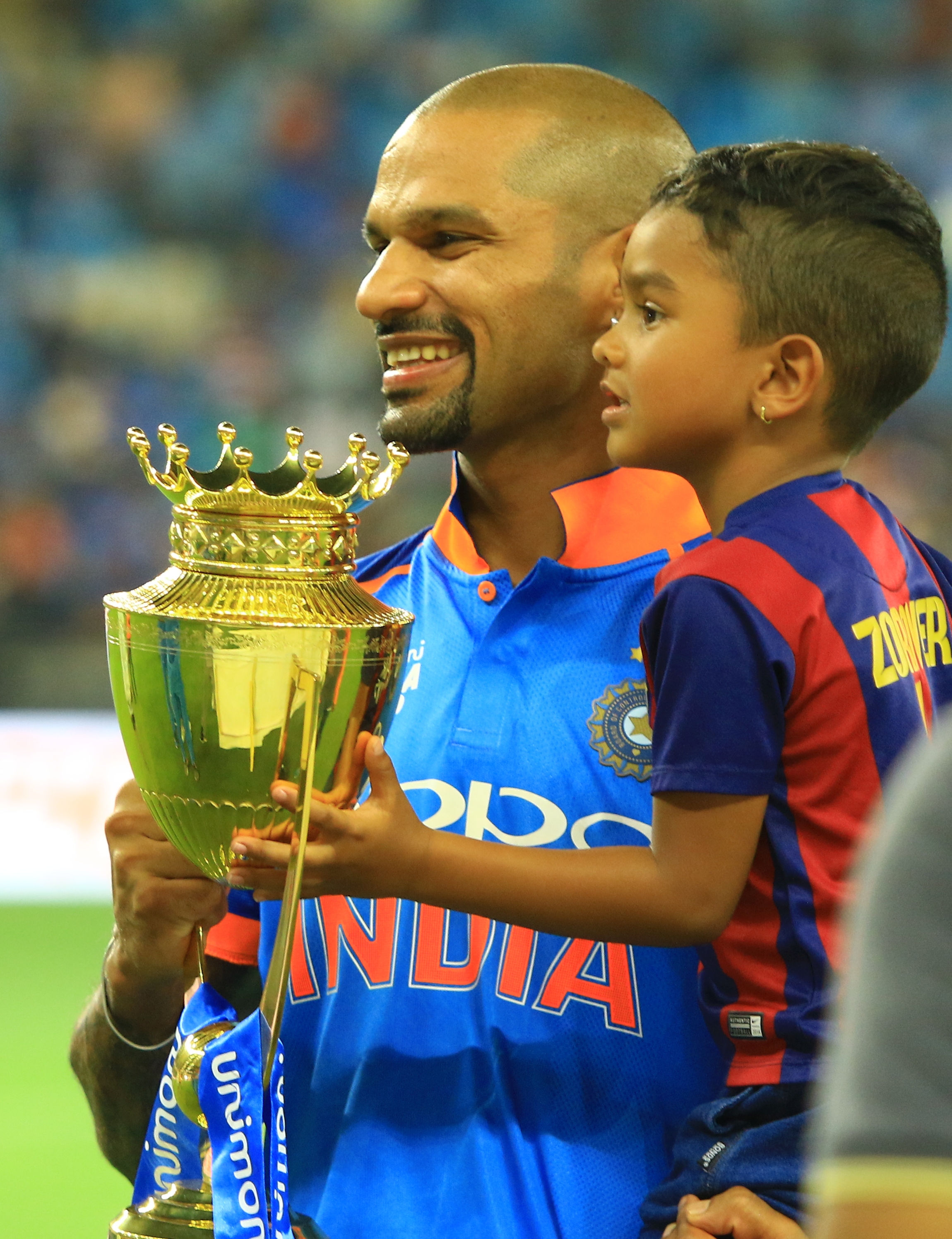 In the photo, Indian cricketer Shikhar Dhawan is seen with his son Zorawar holding trophy at Dubai International Cricket stadium.