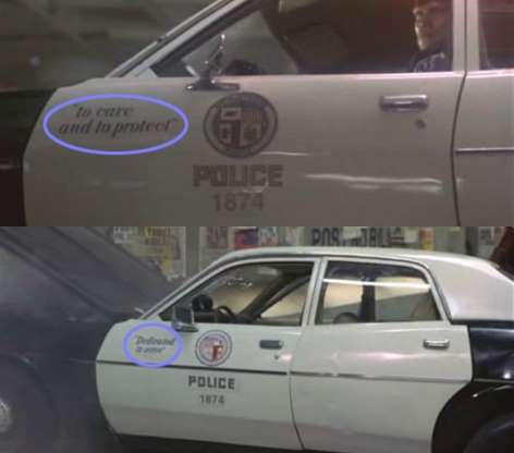 The Terminator: In a scene, police car changes its message from To Care And To Protect to Dedicated To Serve.
